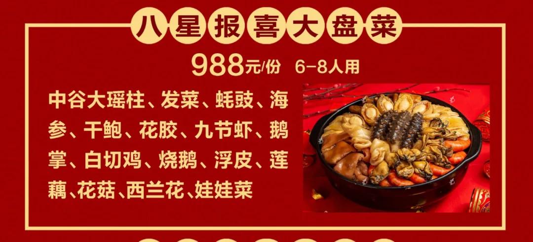 一煲八星报喜大盘菜集齐了山珍和海味,鲍鱼、海参、花胶、鹅掌、分量多到满泻,犹如福气财富,多到盆满钵满