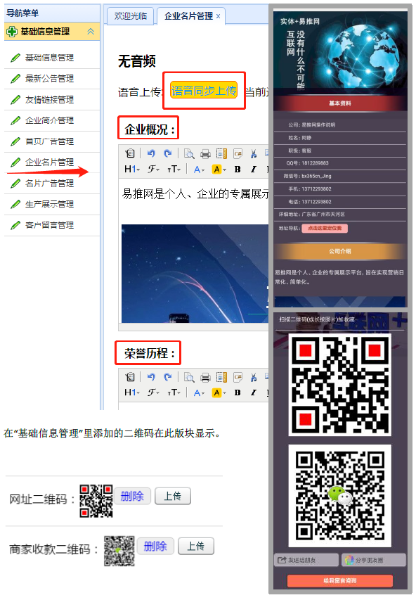 此版块展示“基本资料”为主,还可以展示“企业概况”和“荣誉历程”。