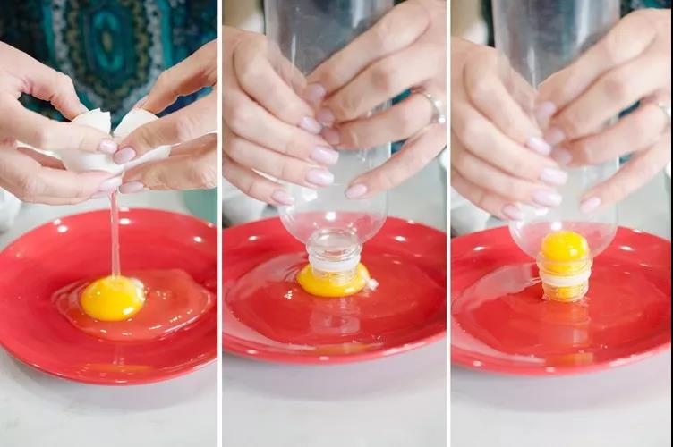 塑料瓶不仅能携带鸡蛋,还能充当蛋黄蛋白的分离器呢。把鸡蛋打到碗里后,用塑料瓶的瓶口对准蛋黄,轻轻一捏塑料瓶,蛋黄就被塑料瓶吸走了,需要的时候不妨试试,很好用。